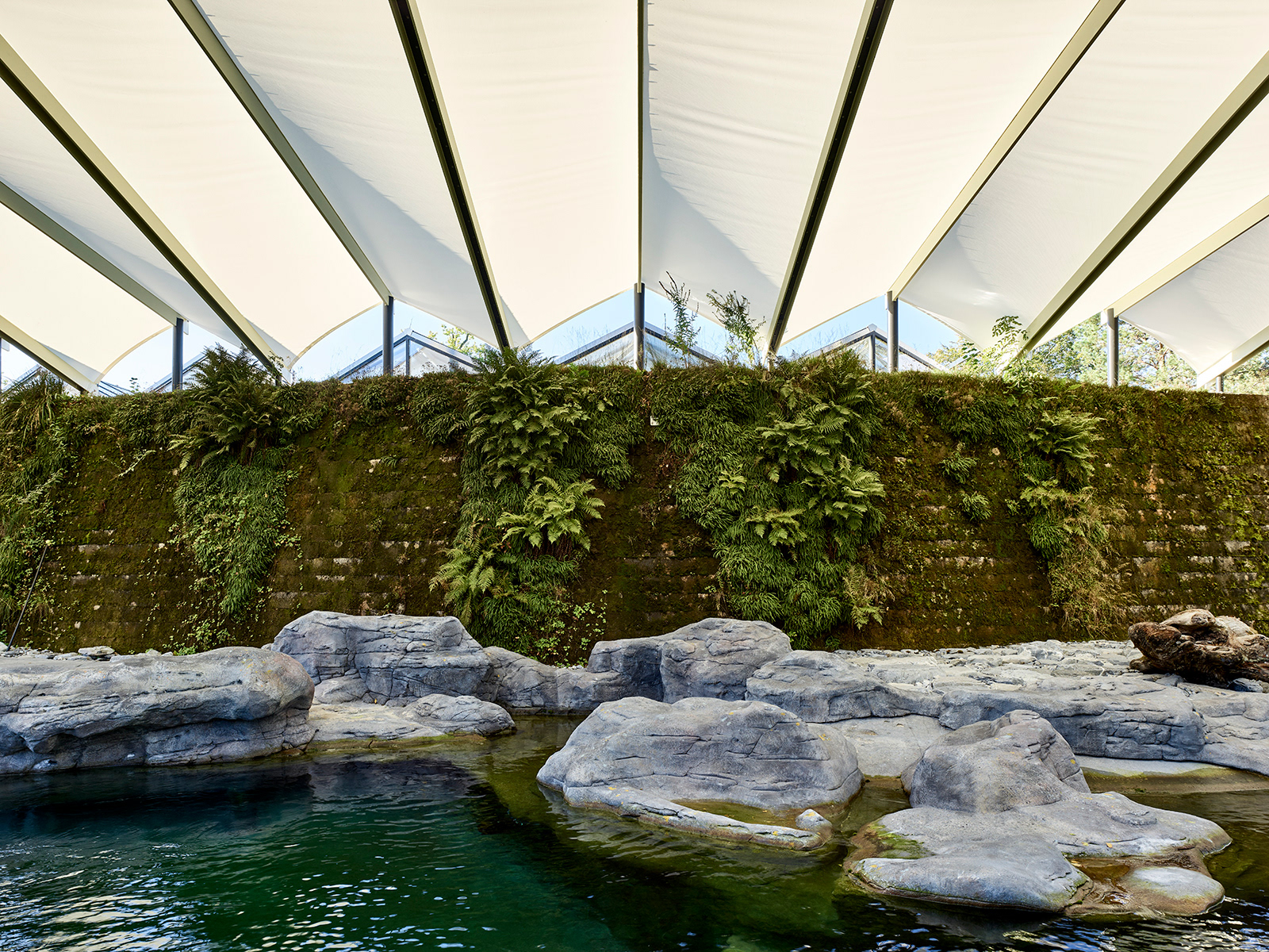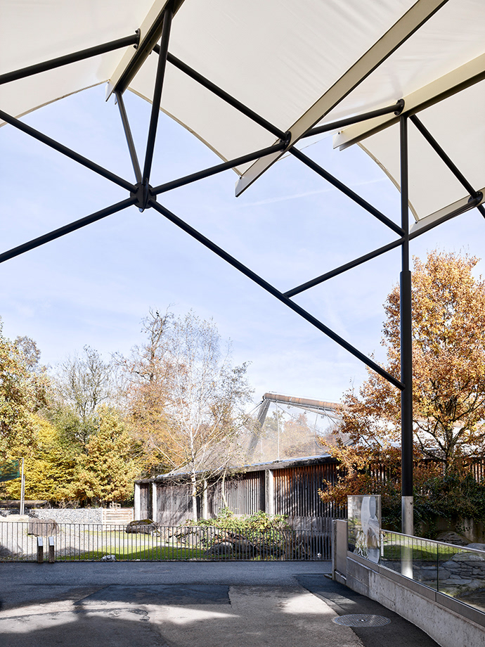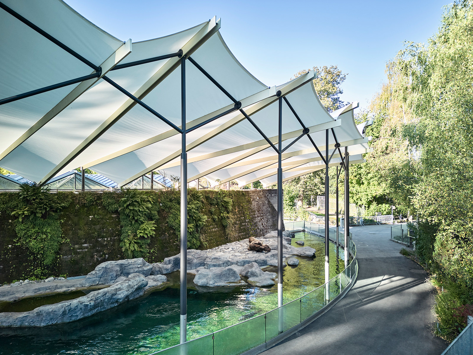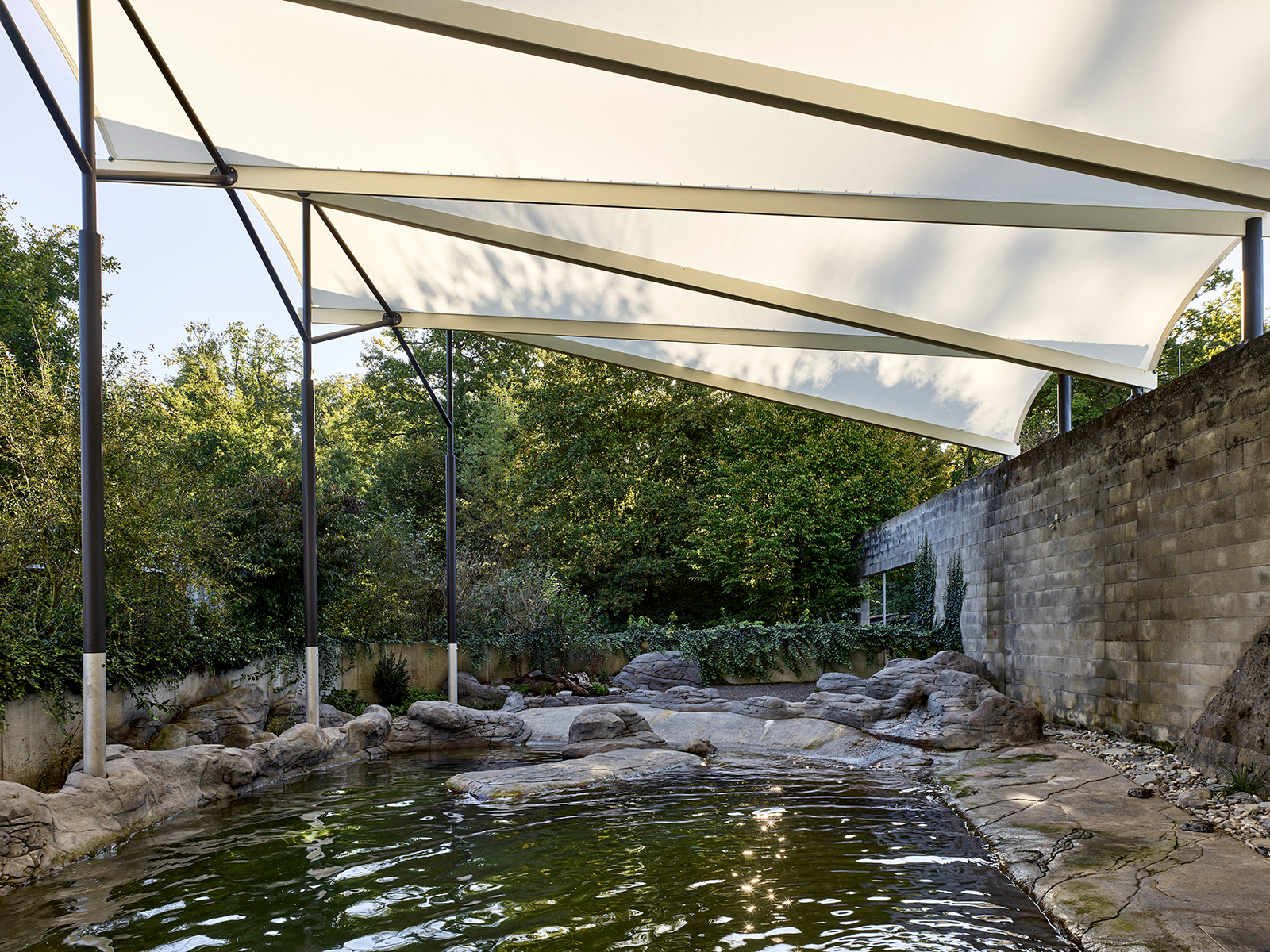 Die filigrane Stahlkonstruktion, die die Segelbahnen spannen, führt die Linienführung des Sheddachs vom denkmalgeschützten Vivarium fort. Zum Beckenrand hin steigt es leicht an, um ein Gefühl der räumlichen Grosszügigkeit zu schaffen. Zur Stabilisation und fachgerechten Spannung des Segels erfahren Tuchbahnen eine Verdrehung, die das Dach nach vorne zusätzlich ansteigen lässt. Die bis zu 13 m langen H-Träger werden auf Mass gefertigt und zweifarbig gehalten, um der Konstruktion die gewünschte Feinheit zu verleihen. Die schlanken Rundstützen wachsen in Chromstahl direkt aus dem Wasser, um dann farblich angepasst und in feinen Verästelungen die Dachkonstruktion zu tragen